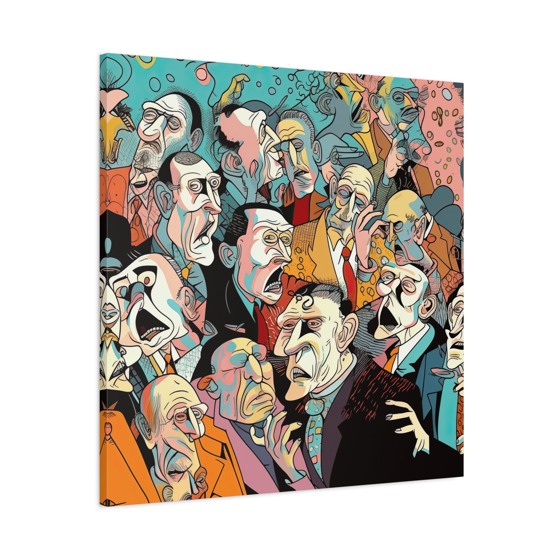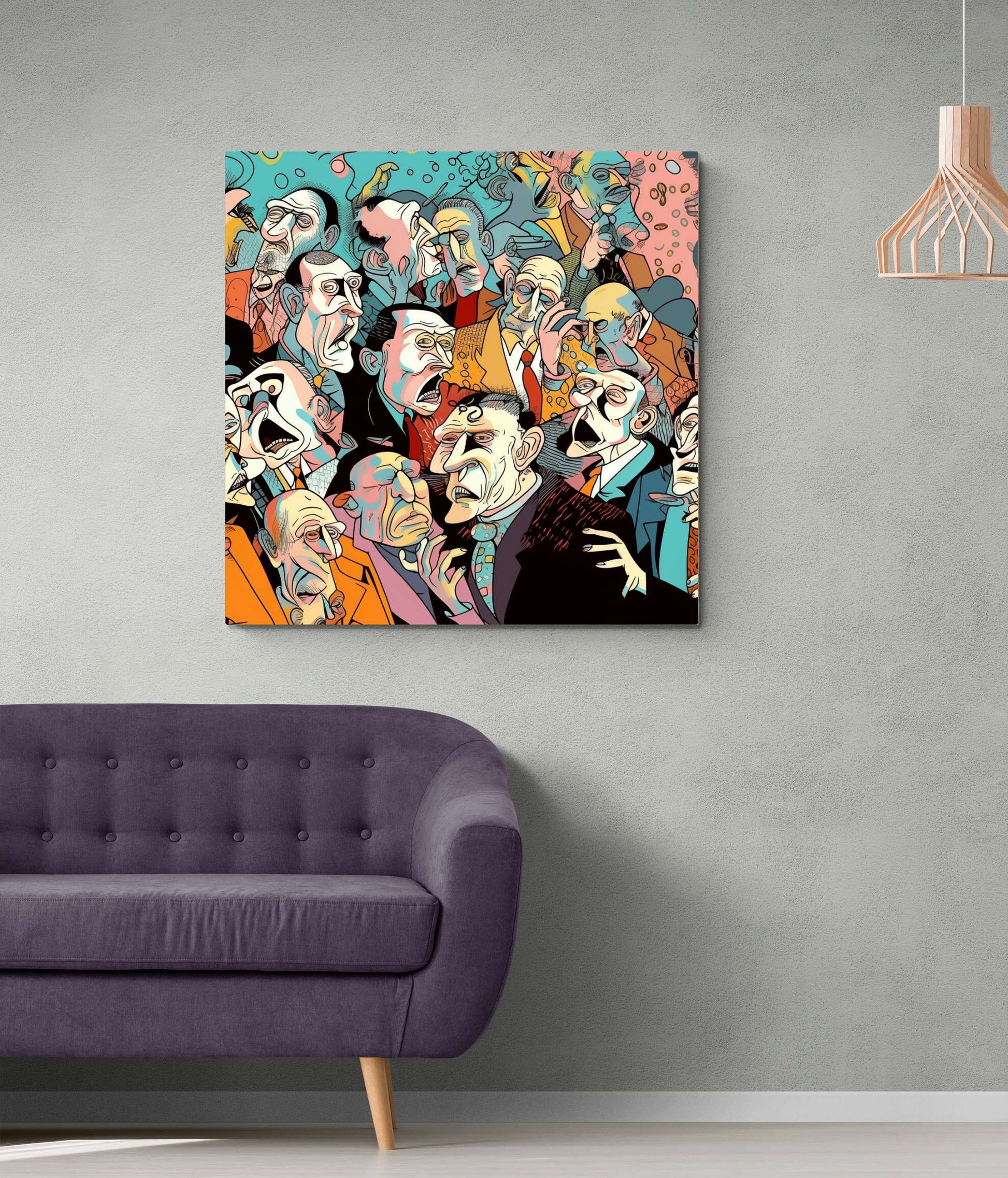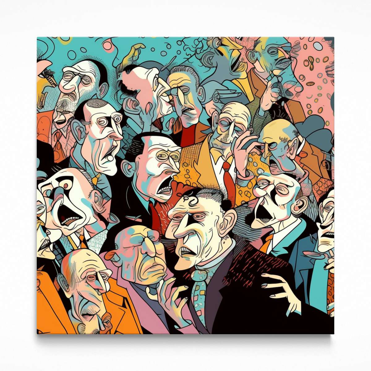 "The Echo Chamber" invites you into a chaotic scene where voices and opinions collide, creating a disorienting swirl of conflicting expressions. The men, each trapped in their own emotional outburst, are rendered in vibrant, exaggerated forms, reflecting the distortion of communication in a world of noise. The overlapping faces and intense colors depict the struggle to be heard in an environment overwhelmed by clamoring voices, a visual metaphor for society’s constant, often misguided, discourse.
