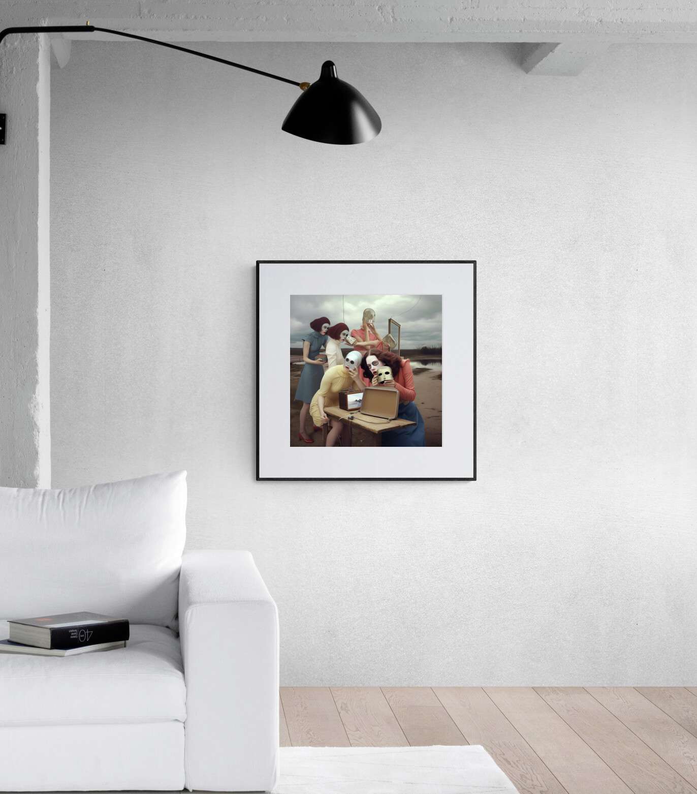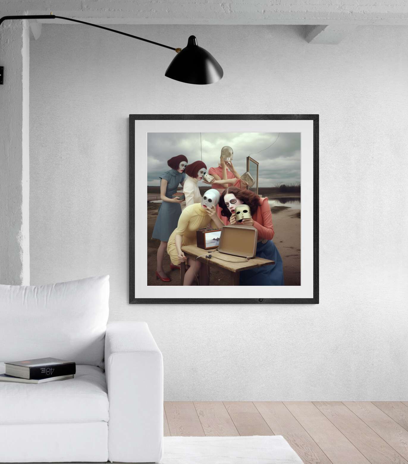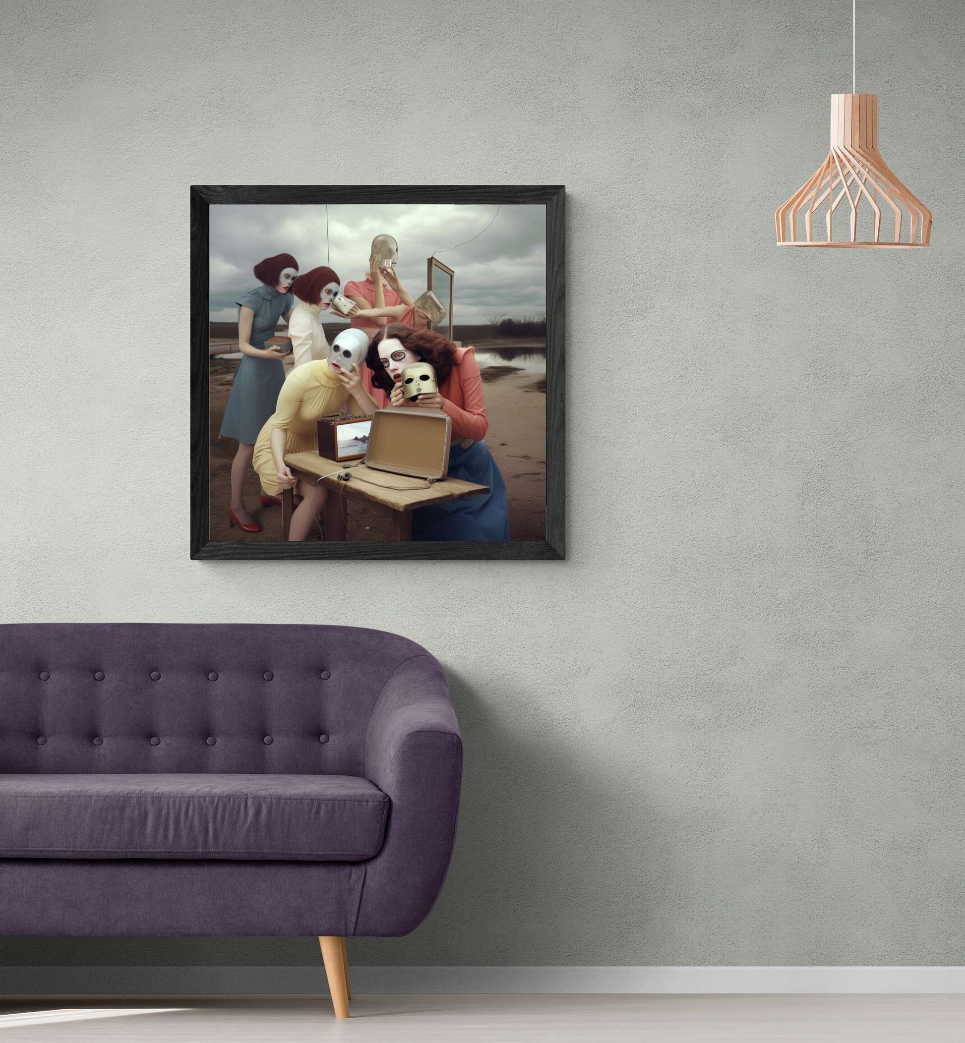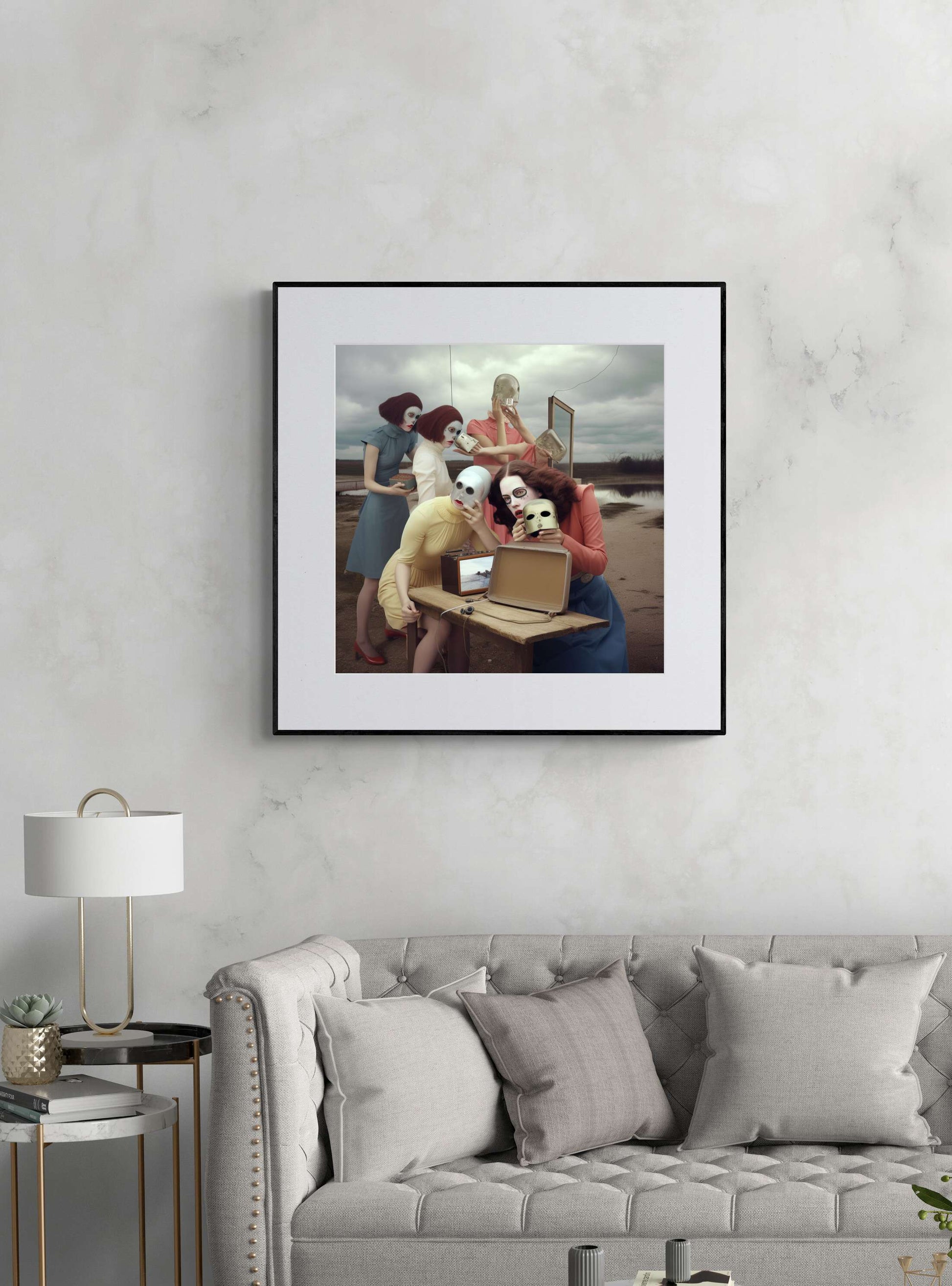 Dive into the enigmatic world of "Masquerade of Reflection," where reality and illusion intertwine. This thought-provoking piece showcases a group of women adorned with haunting masks, capturing a moment of collective curiosity and introspection.