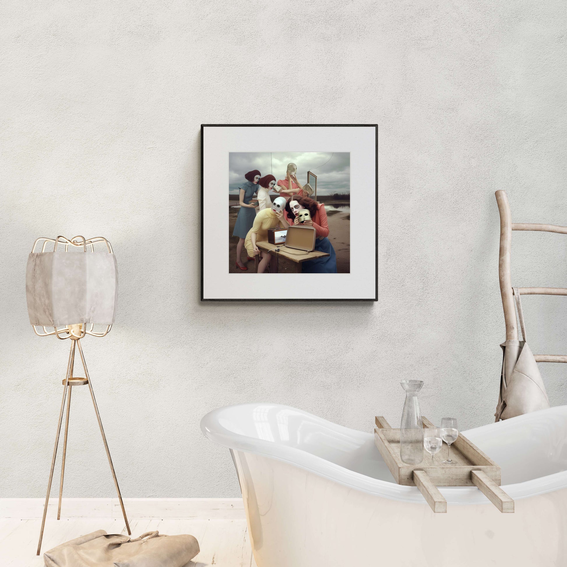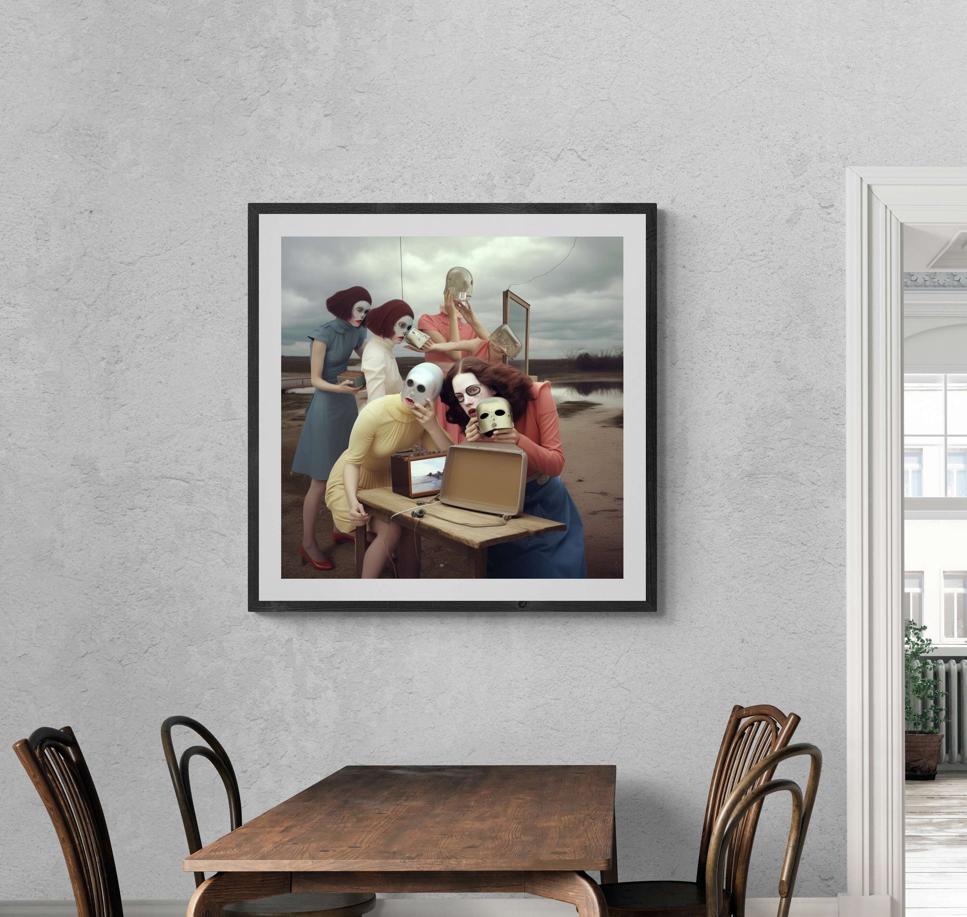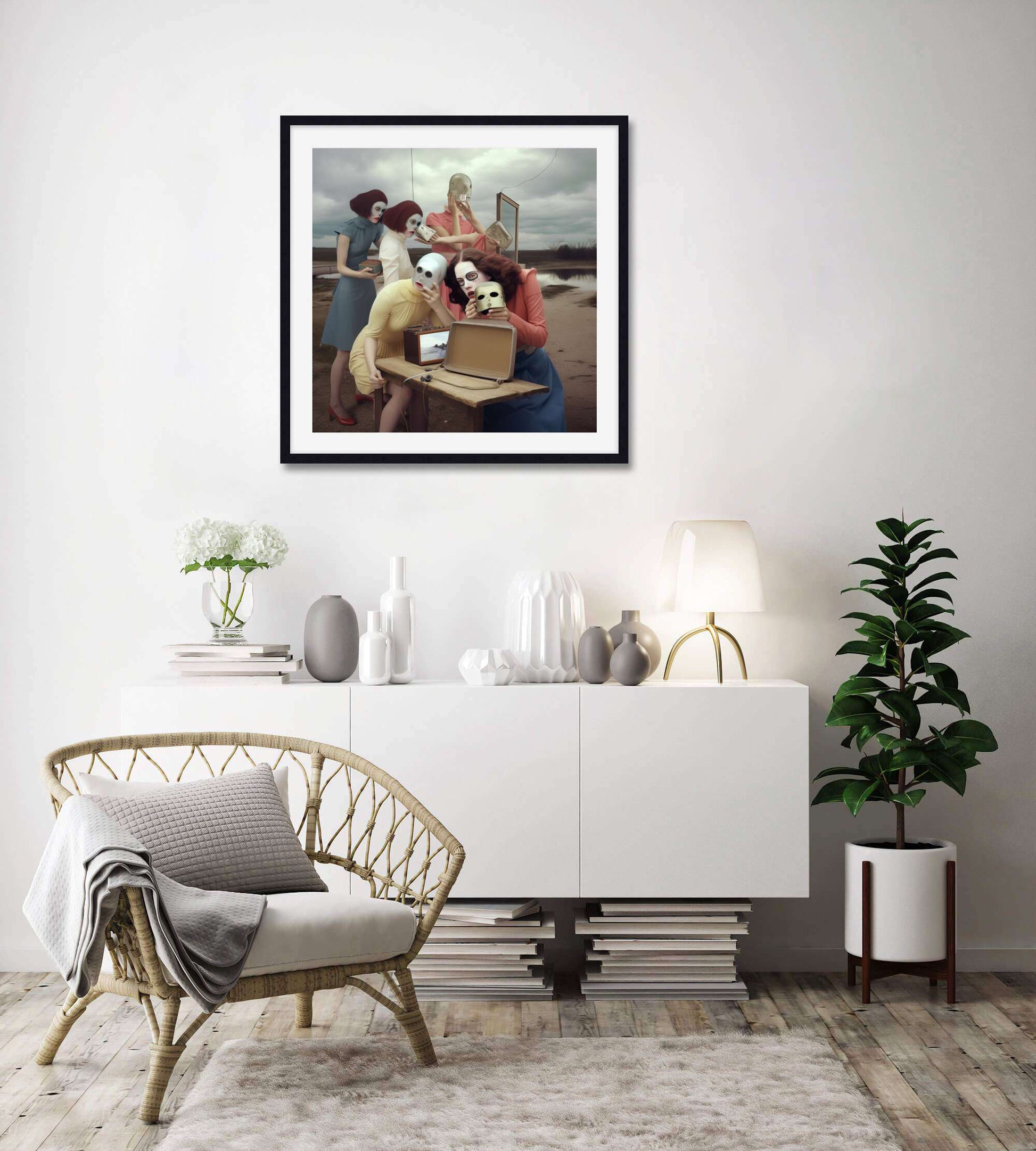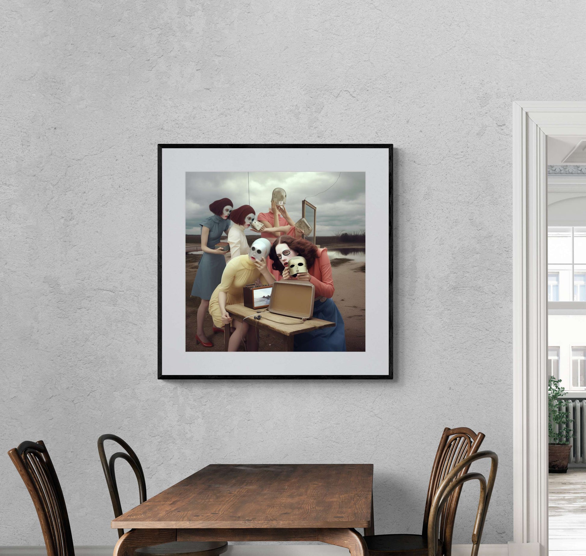Dive into the enigmatic world of "Masquerade of Reflection," where reality and illusion intertwine. This thought-provoking piece showcases a group of women adorned with haunting masks, capturing a moment of collective curiosity and introspection.