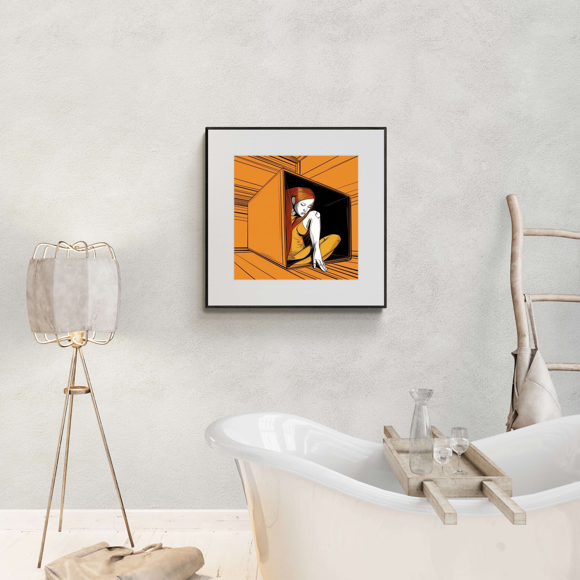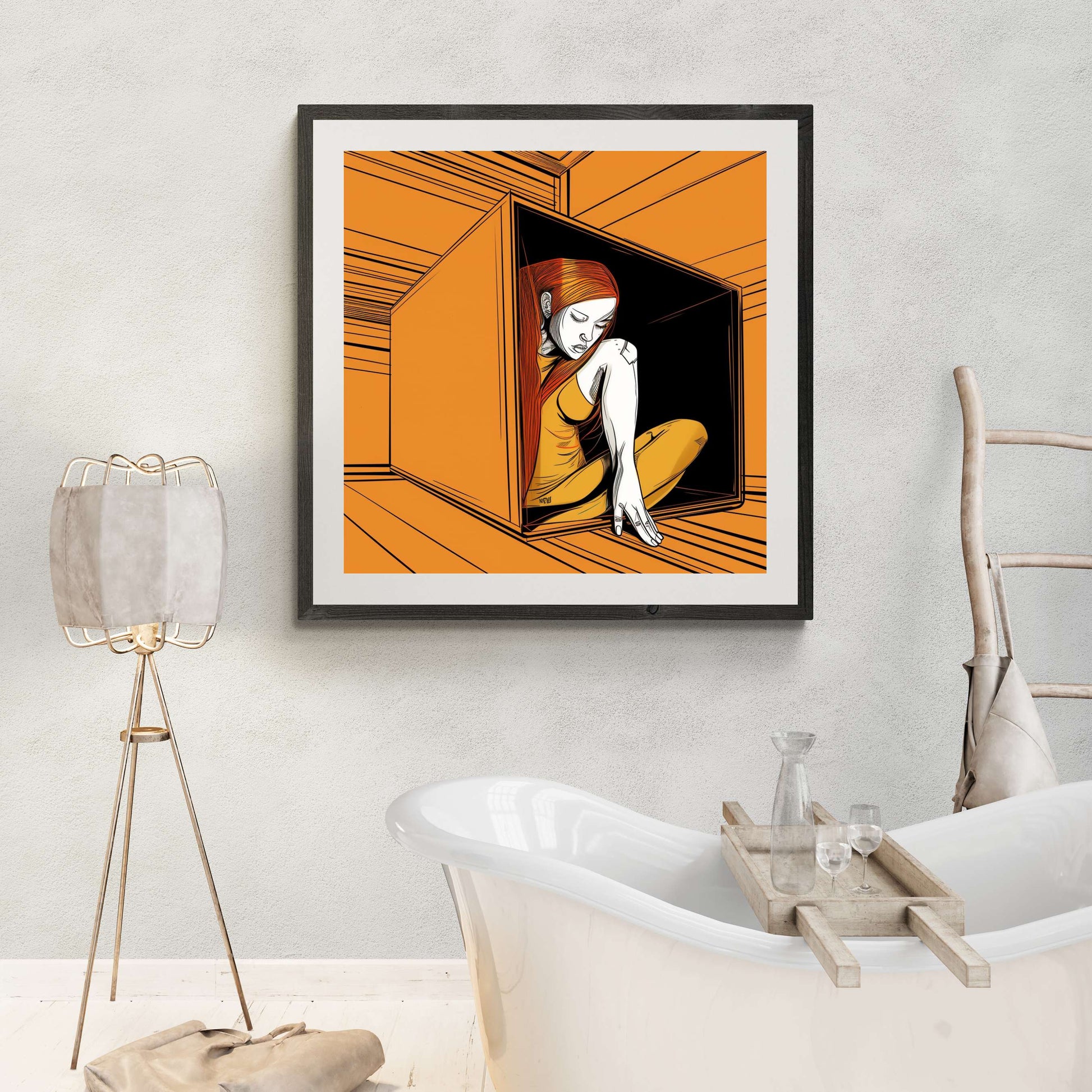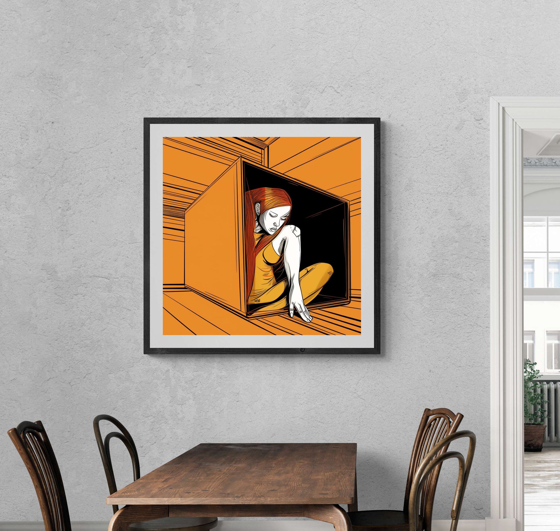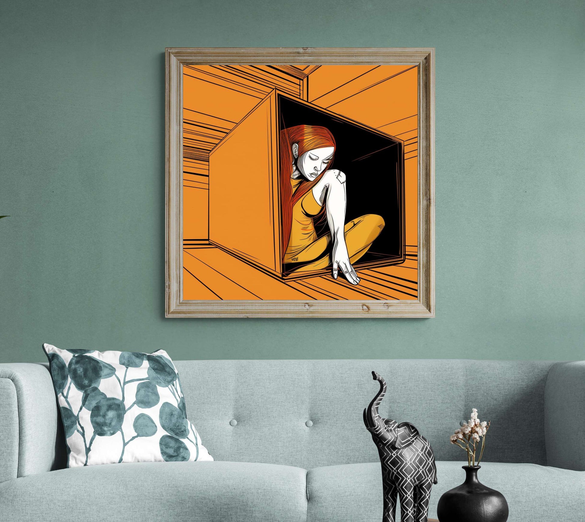 "Trapped in the Box" invites you into a stark, surreal world where confinement and introspection collide. The figure, curled within the narrow walls of a box, symbolizes the emotional and psychological traps we often create for ourselves. The bright orange and black contrasts heighten the sense of isolation and discomfort, while the figure’s pensive expression speaks to the quiet struggle of being confined, not by physical space, but by one's own thoughts and limitations. A powerful commentary on the feeling of being trapped by societal expectations or internal fears, and the yearning to break free.