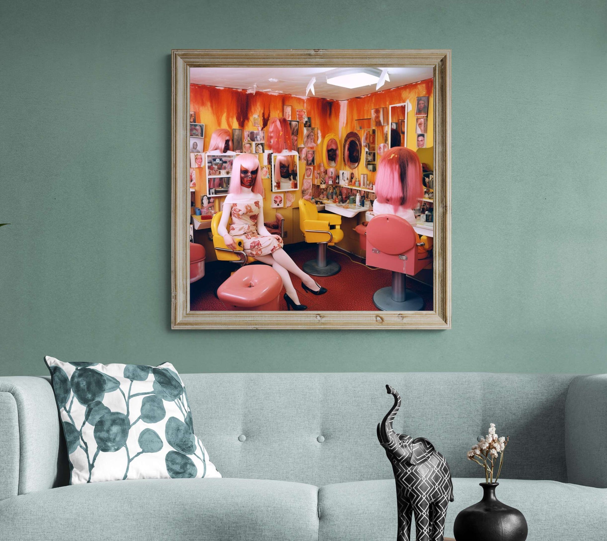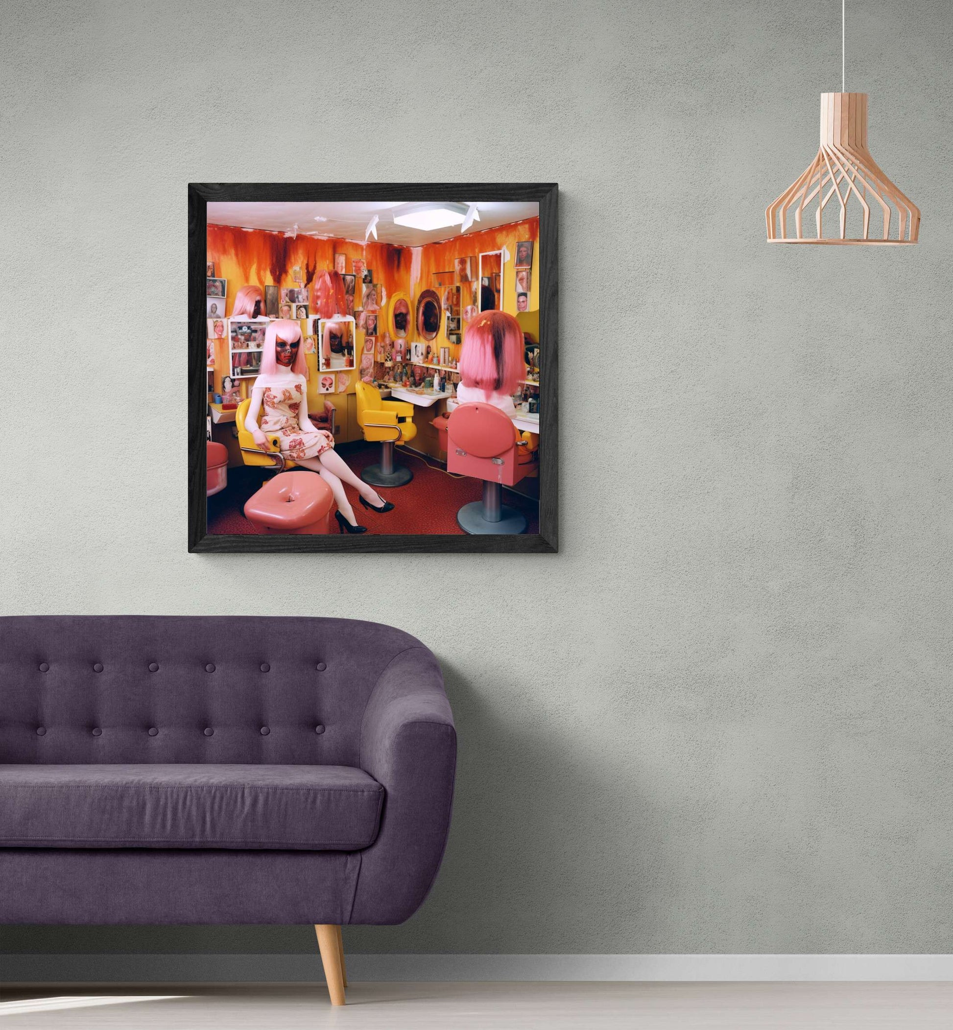 "The Price of Perfection" invites you into a surreal and unsettling beauty salon, where the pursuit of beauty becomes an eerie, disorienting experience. The figure, sitting calmly in the vibrant yellow chair, is surrounded by images of idealized beauty, yet her appearance tells a darker story—a transformation marked by discomfort and unnaturalness. The chaotic pink wigs and distorted reflections in the mirrors explore the tension between external appearances and internal realities. A stark commentary on the lengths to which we go in the name of beauty and conformity, and the price we pay for an impossible ideal.