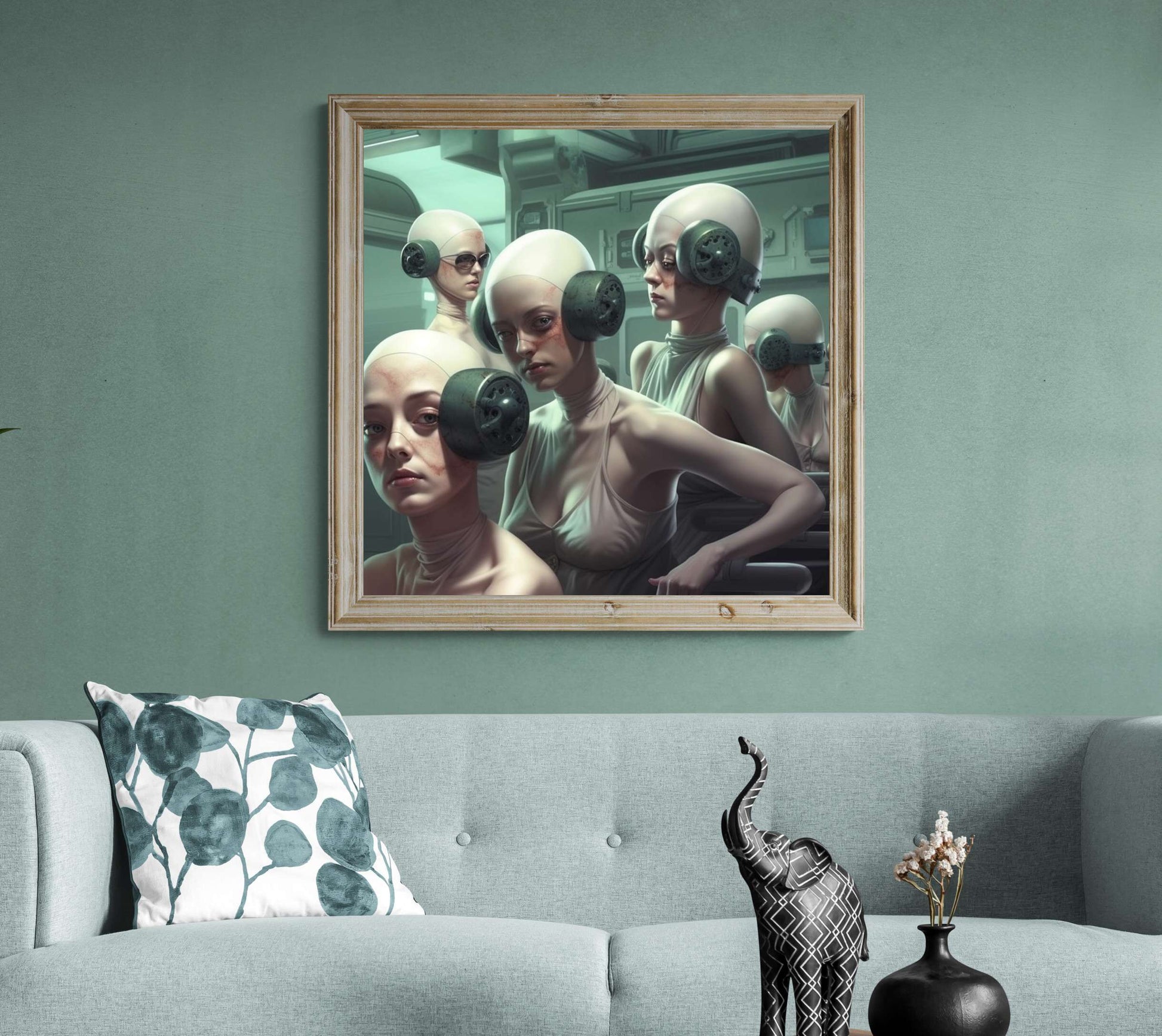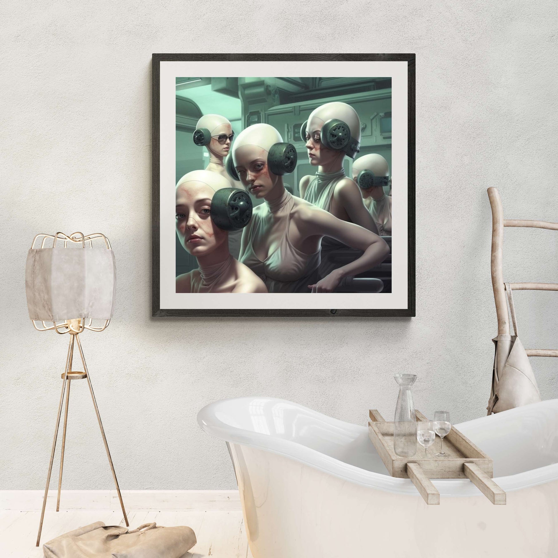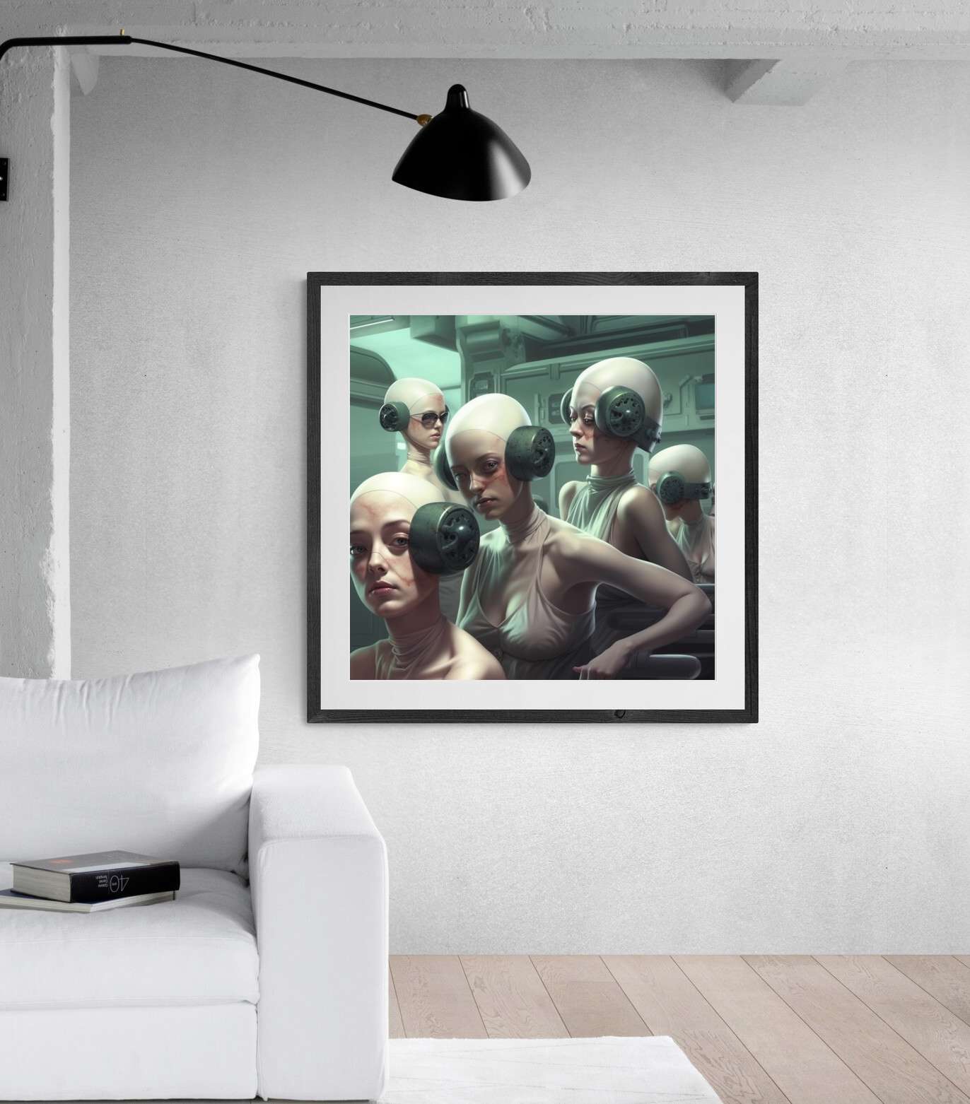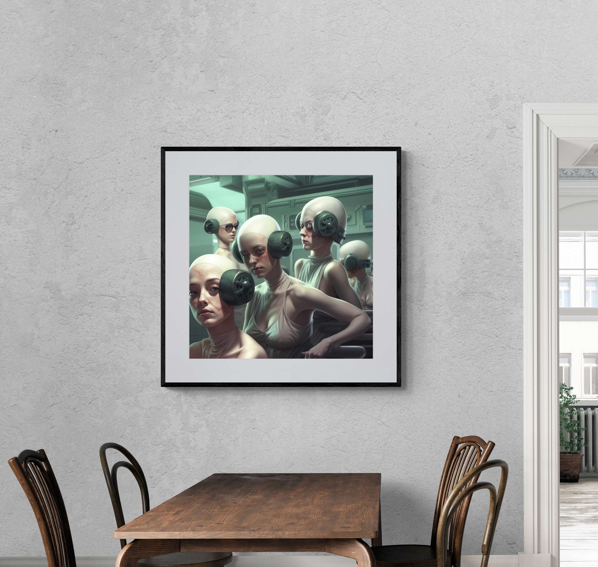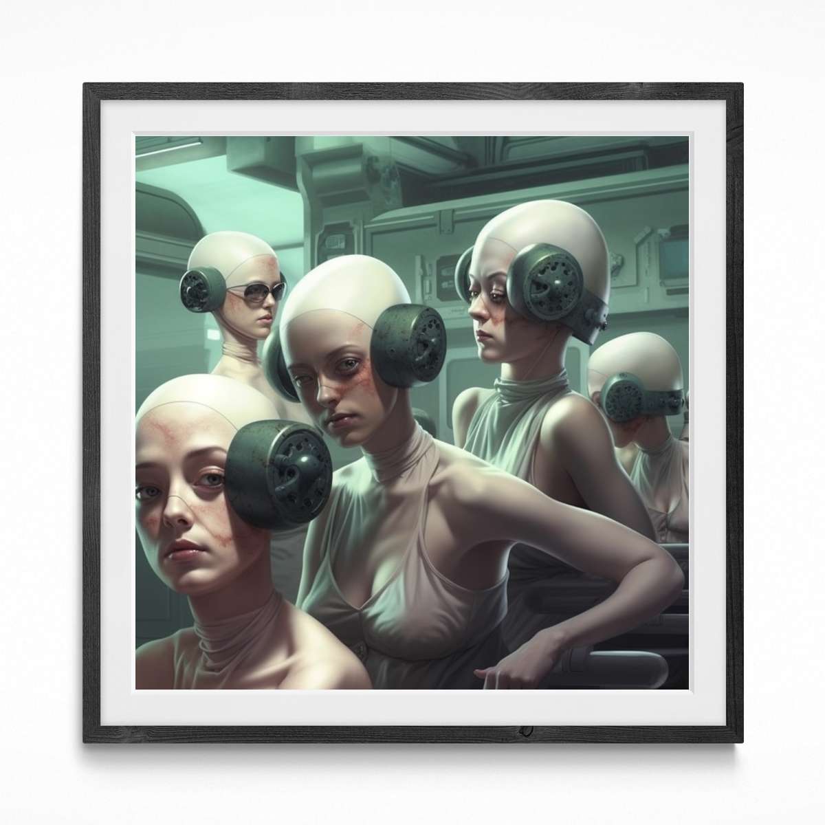 "Silent Rebellion" invites you into a haunting future where individuality is muted and conformity is enforced. The figures, wearing bulky, industrial headphones, seem trapped in a sterile, controlled environment, their faces marked with subtle signs of resistance. This surreal image speaks to the dehumanizing effects of societal pressures and the quiet strength required to hold on to one's identity in a world that seeks to suppress it.