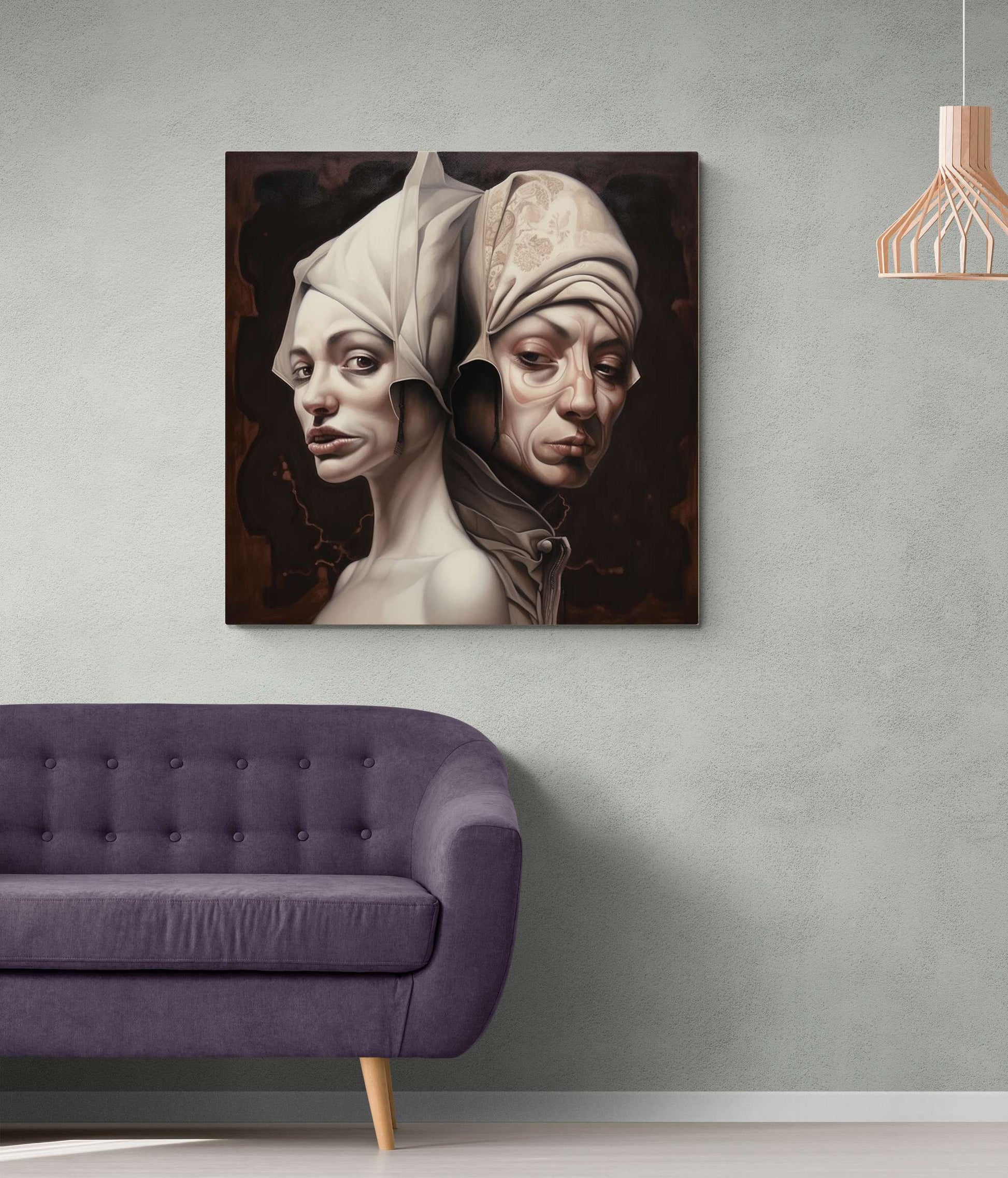 "Shadowed Duality" explores the tension between the visible self and the hidden aspects of our personality. The two figures, their heads bound by delicate fabric, embody the concept of the shadow ego—those repressed facets of ourselves that quietly shape our identity. The contrasting expressions reflect the inner conflict between the face we present to the world and the darker, unacknowledged part of our psyche. The fabric acts as both a prison and a veil, concealing yet defining their true essence. This work invites reflection on how much of ourselves we choose to show and how much we suppress, caught in a perpetual dance between light and shadow.