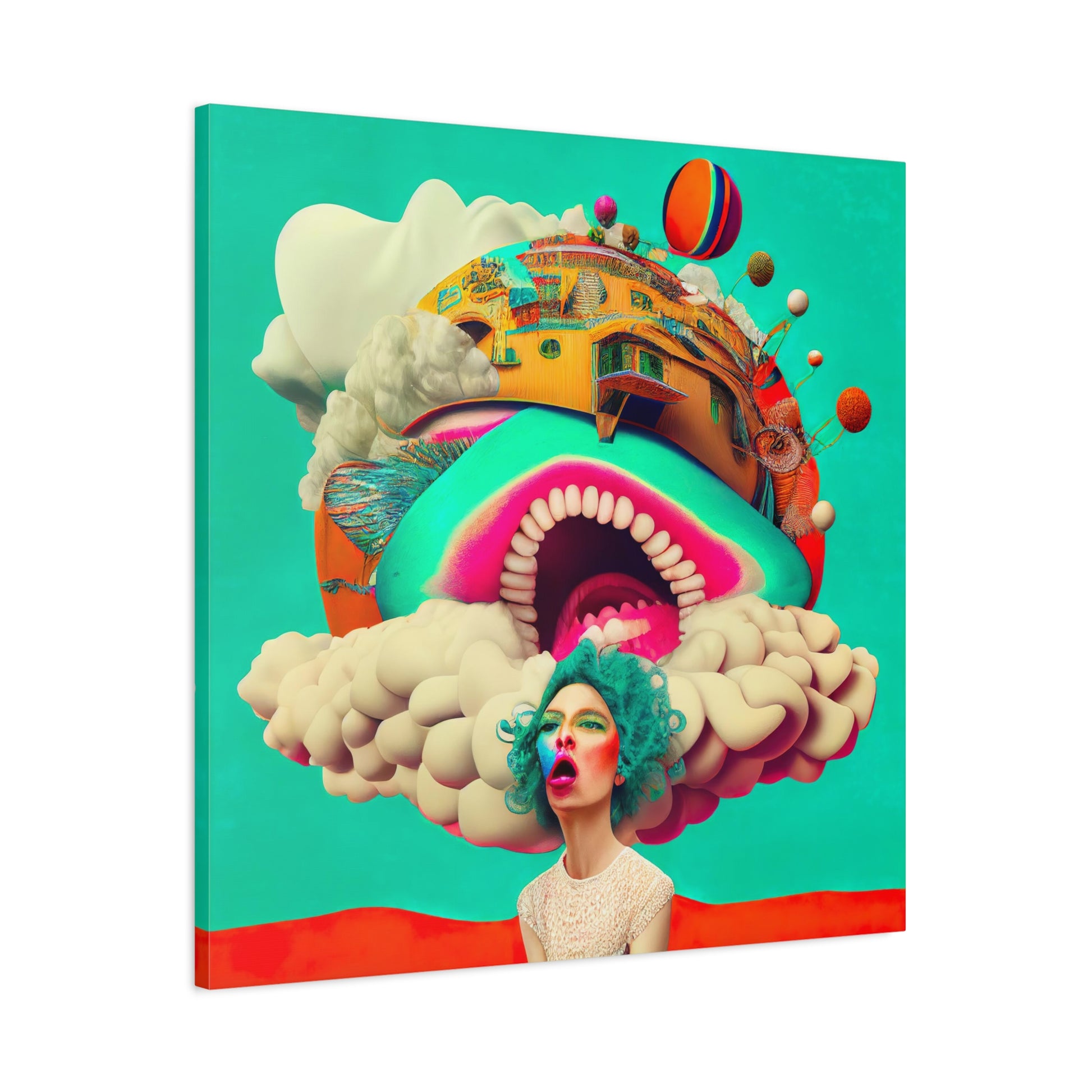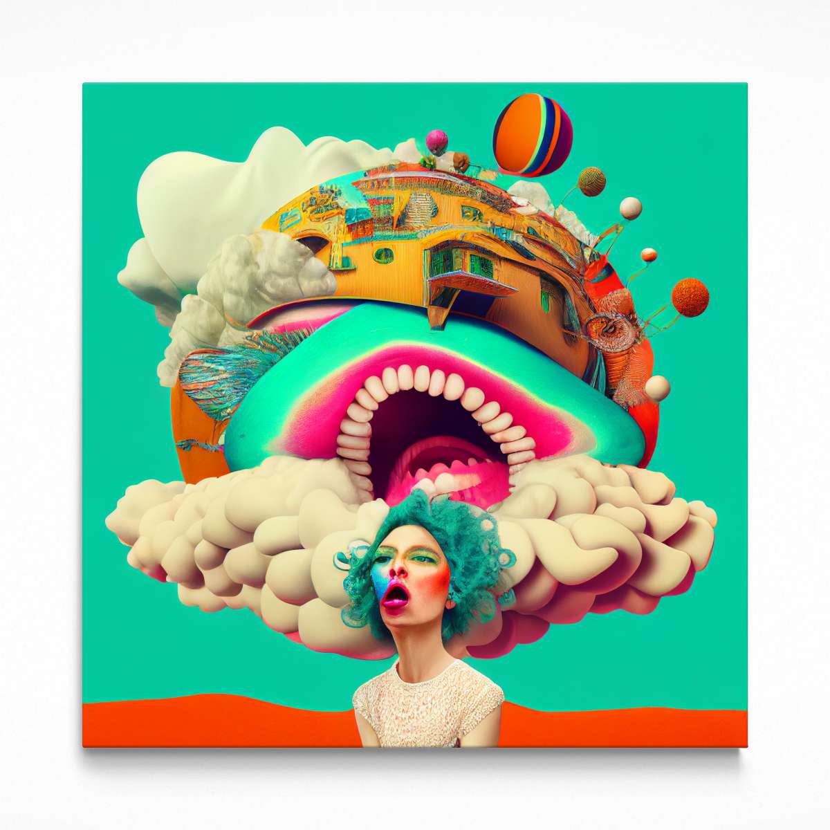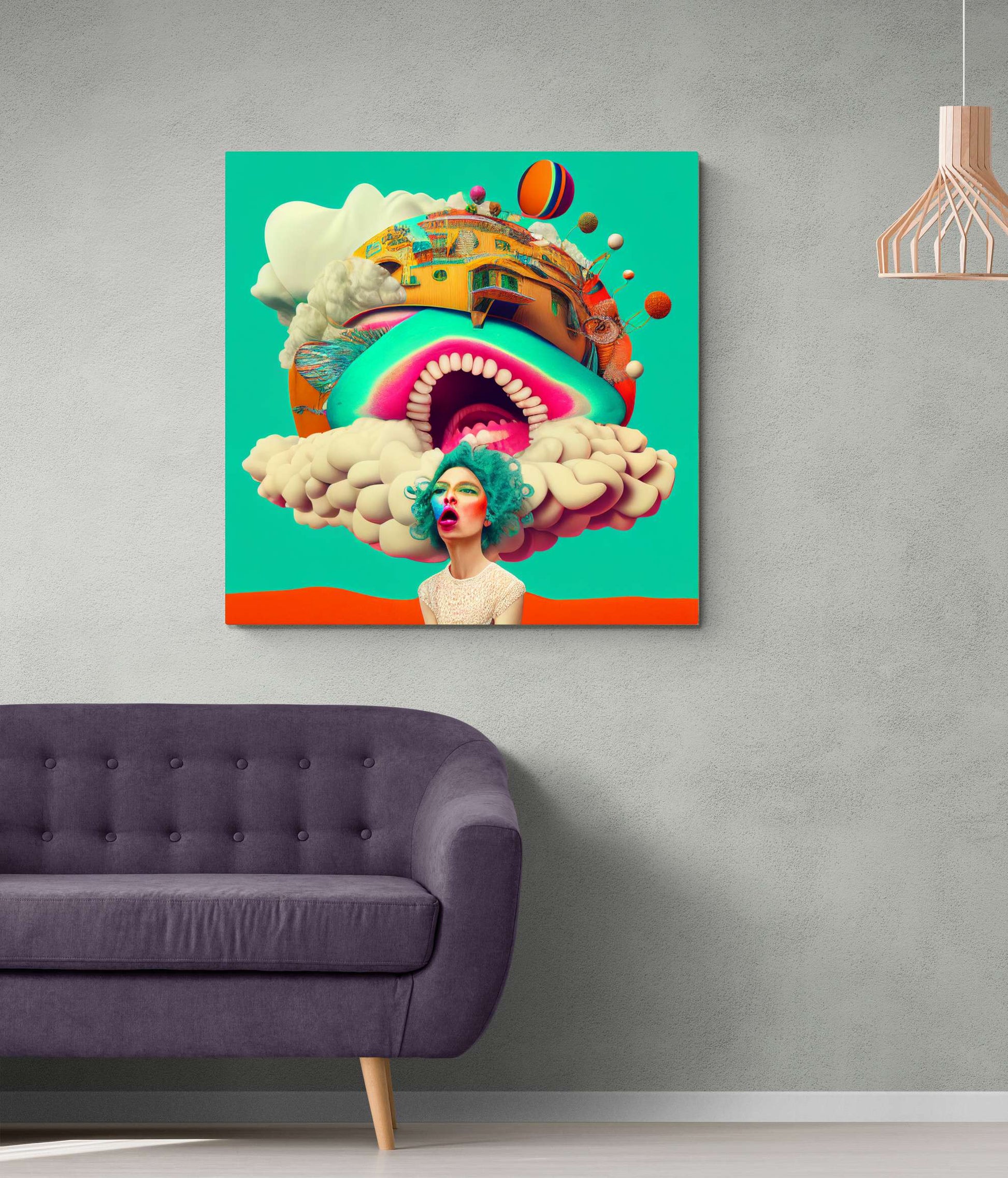 "Consumed by Madness" invites you into a surreal, chaotic world where the boundaries of sanity begin to unravel. The figure, standing beneath a surreal landscape erupting from her mind, is overwhelmed by the vivid, swirling chaos that threatens to devour her. The exaggerated mouth and the strange, floating objects symbolize the unstoppable force of madness, slowly consuming both thought and reality. A haunting exploration of how unchecked emotions and thoughts can engulf one's sense of self, turning clarity into distorted confusion.