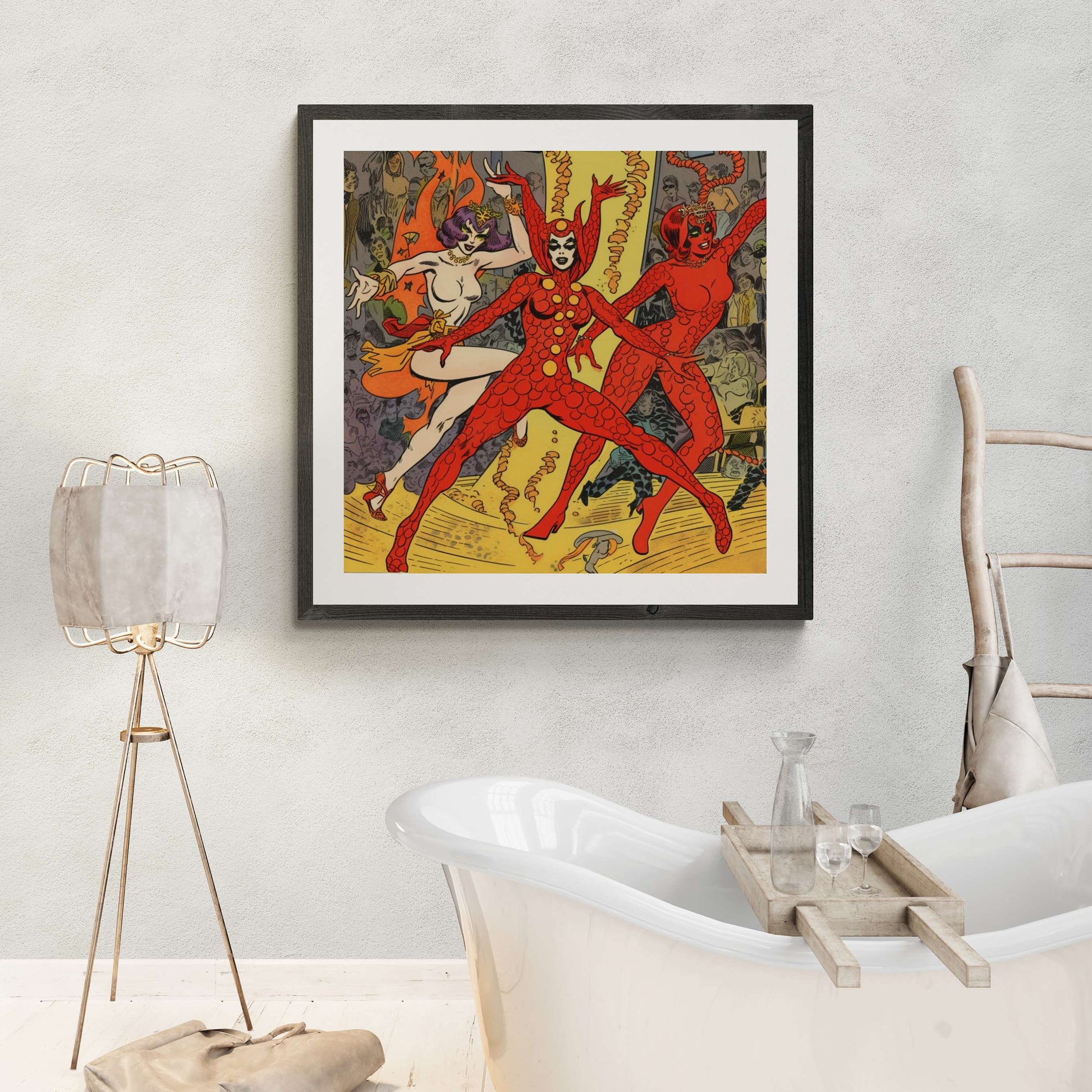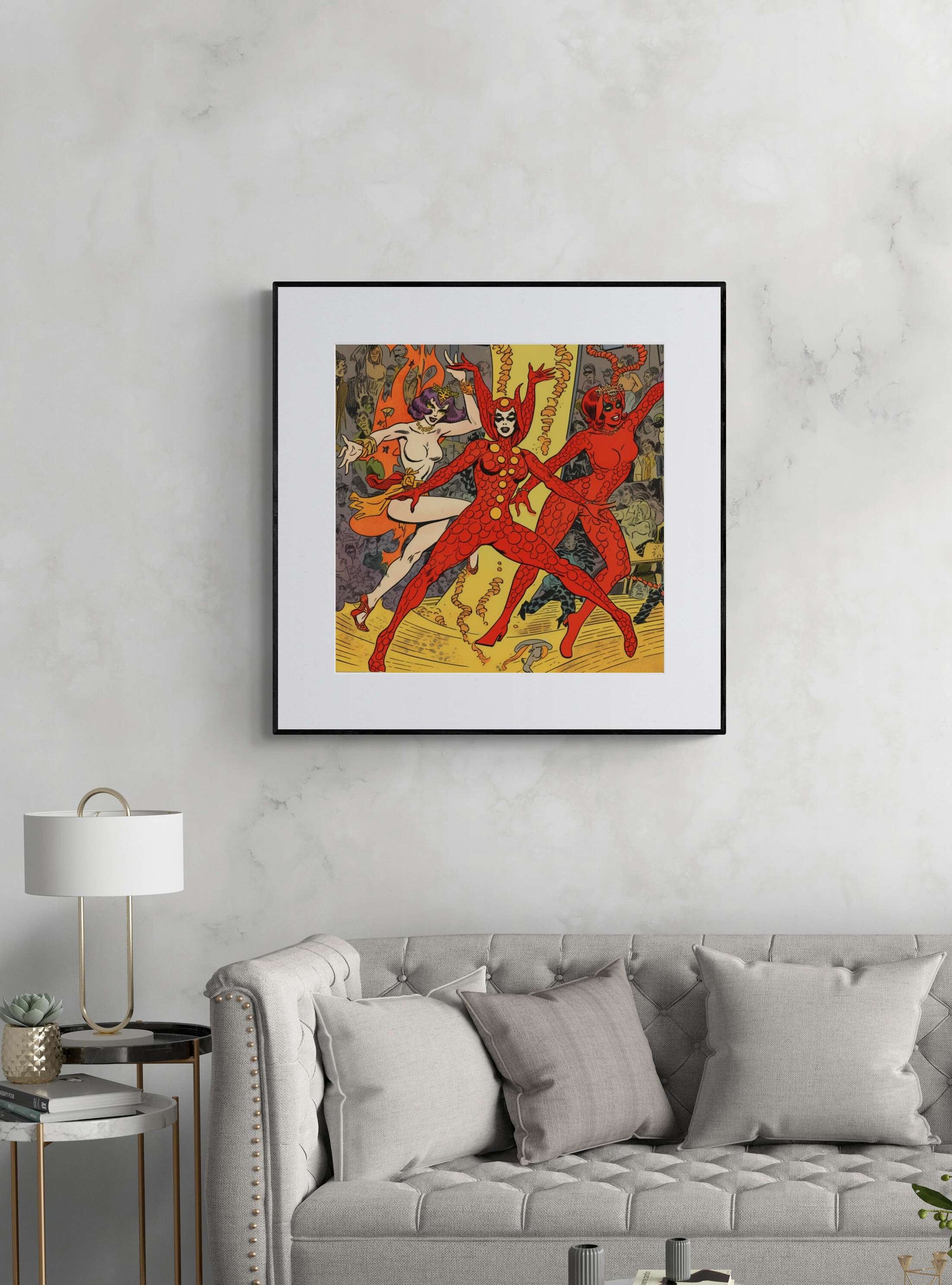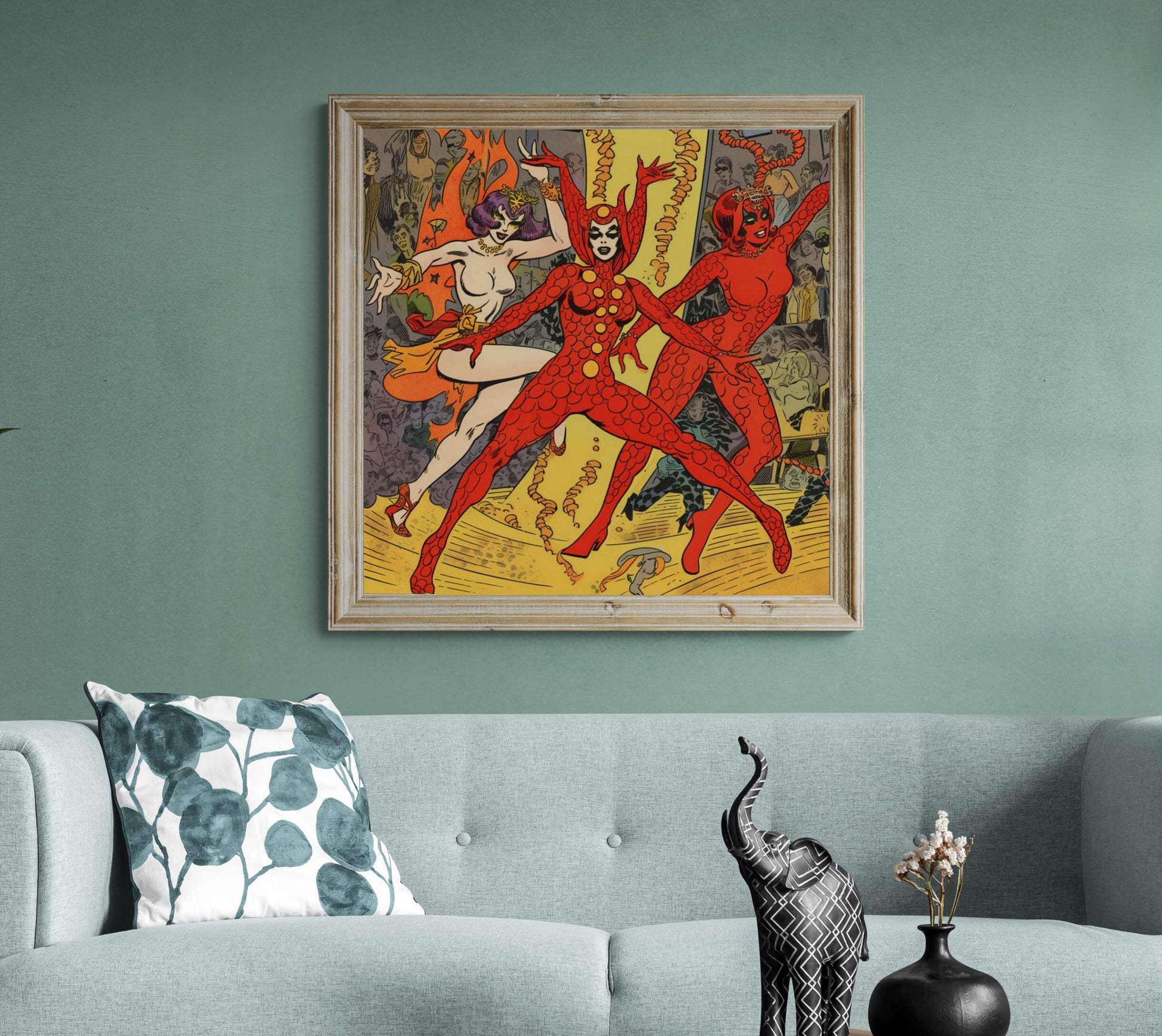 "Carnival of Excess" invites you to step into a world of vibrant, chaotic spectacle. The figures, adorned in extravagant, tight-fitting costumes, move with bold confidence, captivating the crowd with their mesmerizing dance. The bold red hues, exaggerated features, and energetic movement embody the surreal nature of fame and the intoxicating allure of excess. A wild celebration where identity becomes a performance, and the boundaries between self-expression and the public gaze blur.