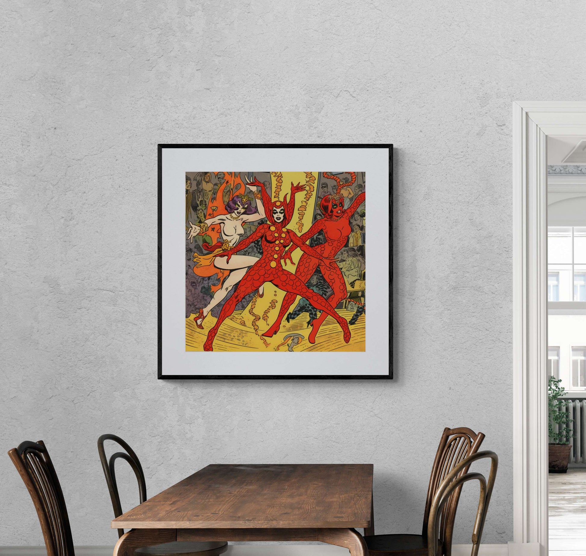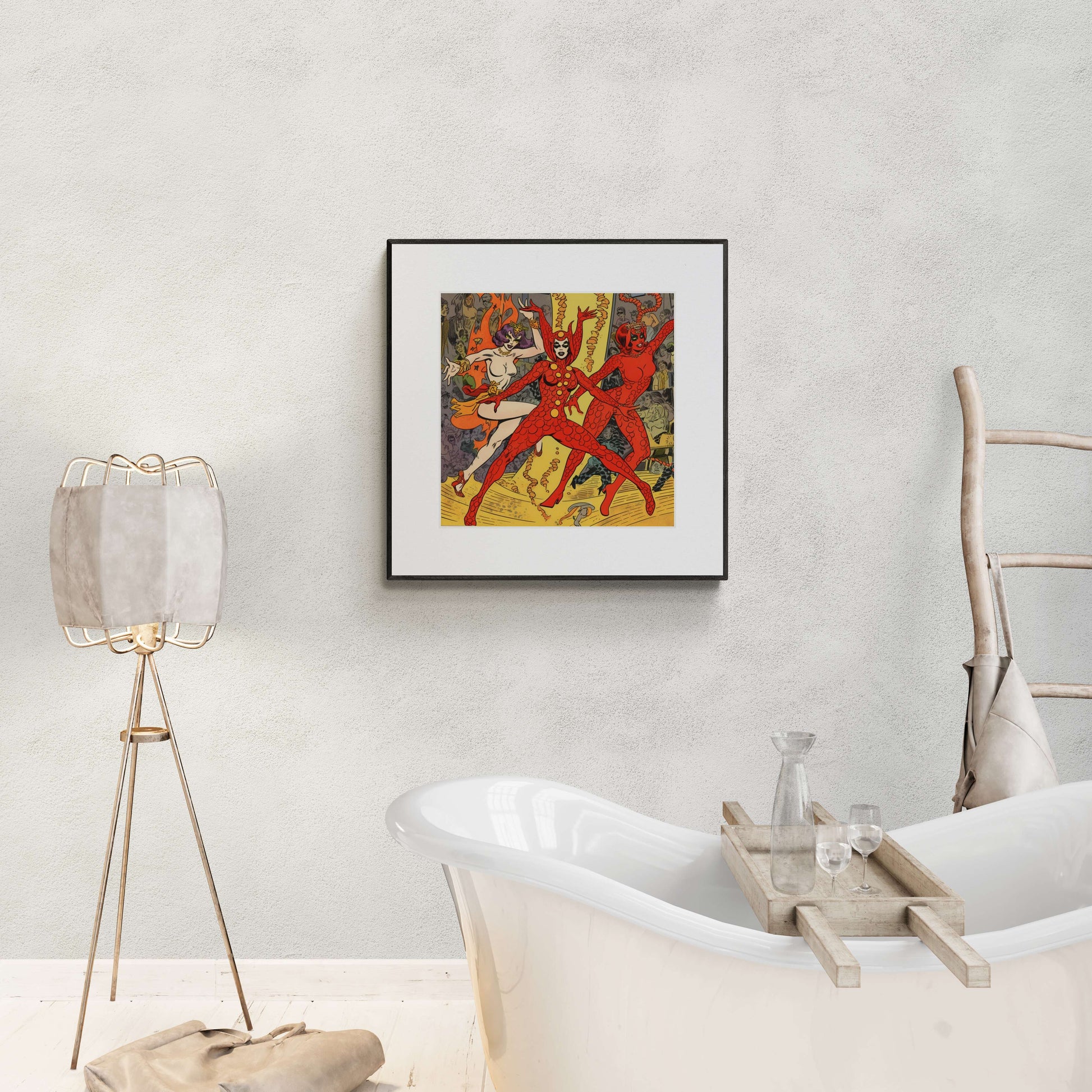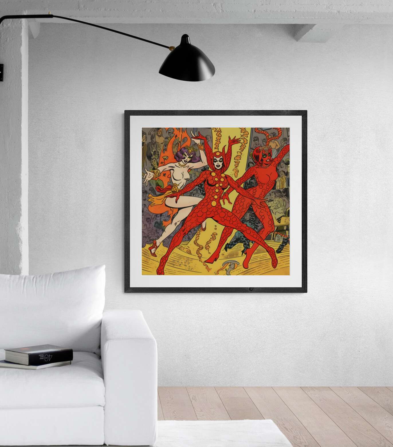 "Carnival of Excess" invites you to step into a world of vibrant, chaotic spectacle. The figures, adorned in extravagant, tight-fitting costumes, move with bold confidence, captivating the crowd with their mesmerizing dance. The bold red hues, exaggerated features, and energetic movement embody the surreal nature of fame and the intoxicating allure of excess. A wild celebration where identity becomes a performance, and the boundaries between self-expression and the public gaze blur.
