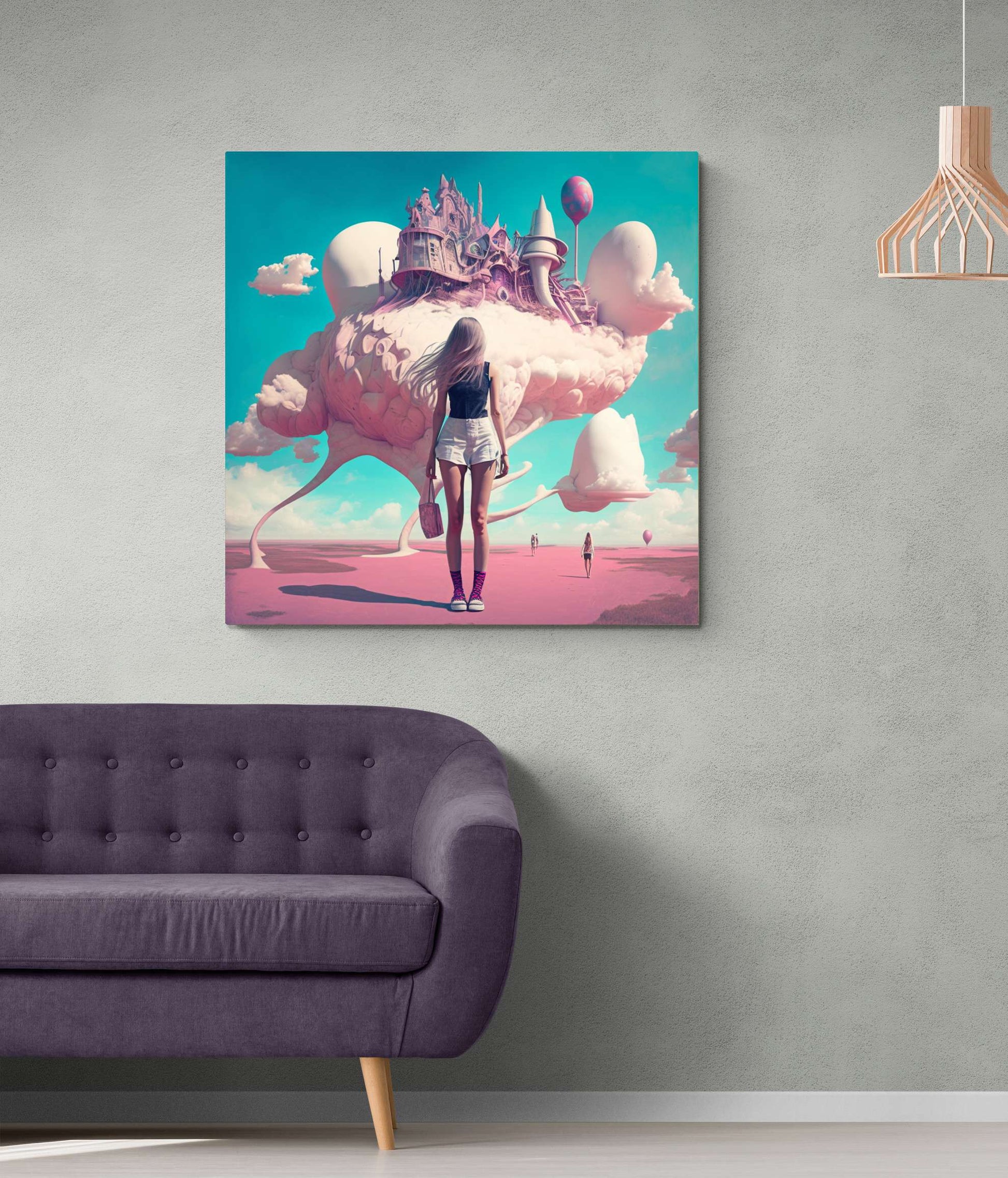 "Clouded Dreams" invites you into a whimsical, surreal landscape where reality and fantasy collide. A lone figure stands before a dreamlike world, with a floating, whimsical mansion emerging from the clouds. The soft pink tones and playful shapes speak to the innocence and fragility of dreams, while the distant figures walking away symbolize the journey of finding one's own path amidst the vast, surreal world. A commentary on the tension between fantasy and reality, and the quiet exploration of self in a world of endless possibilities.