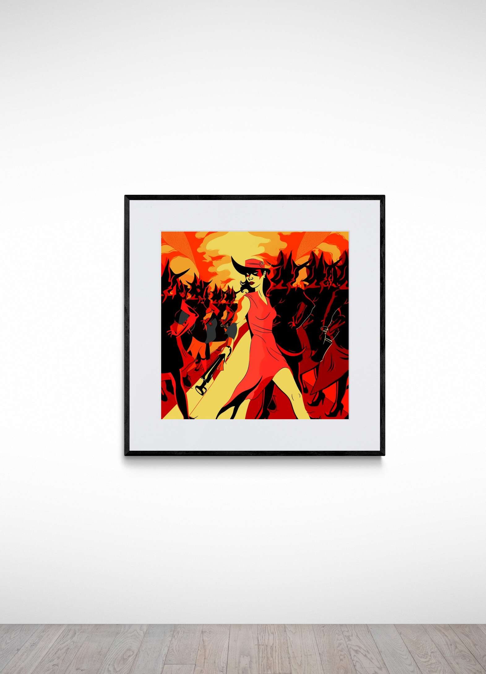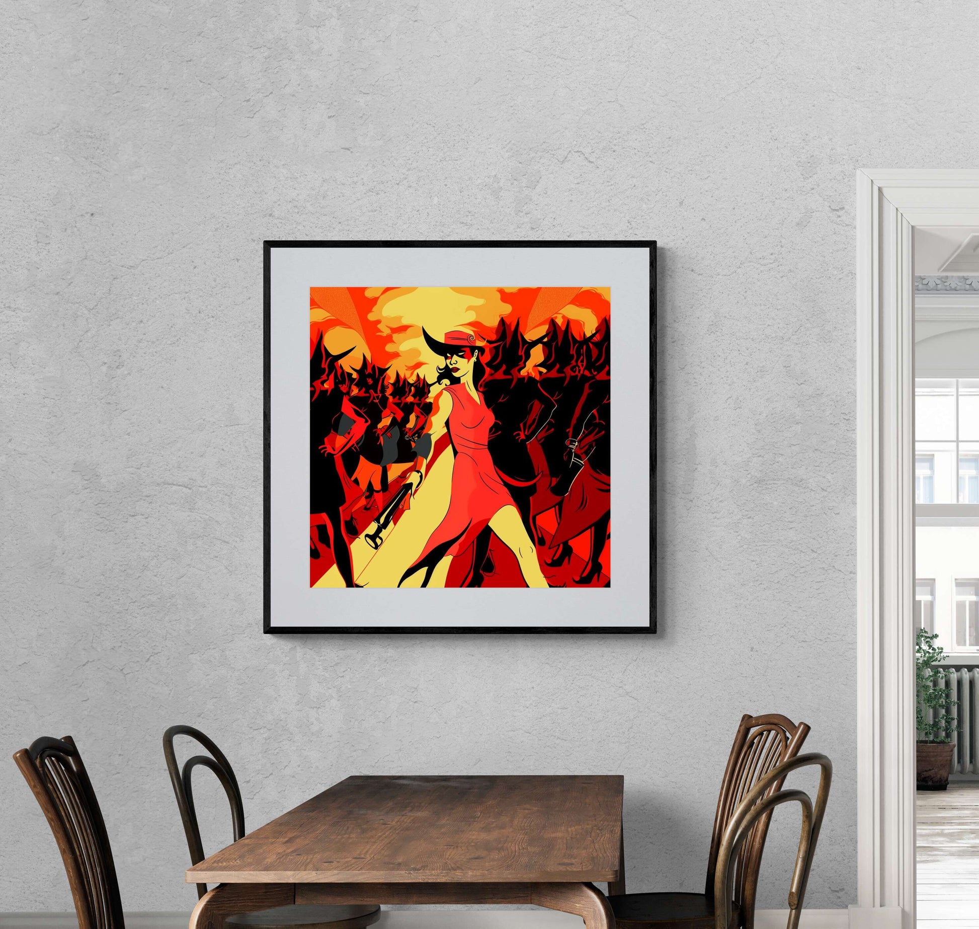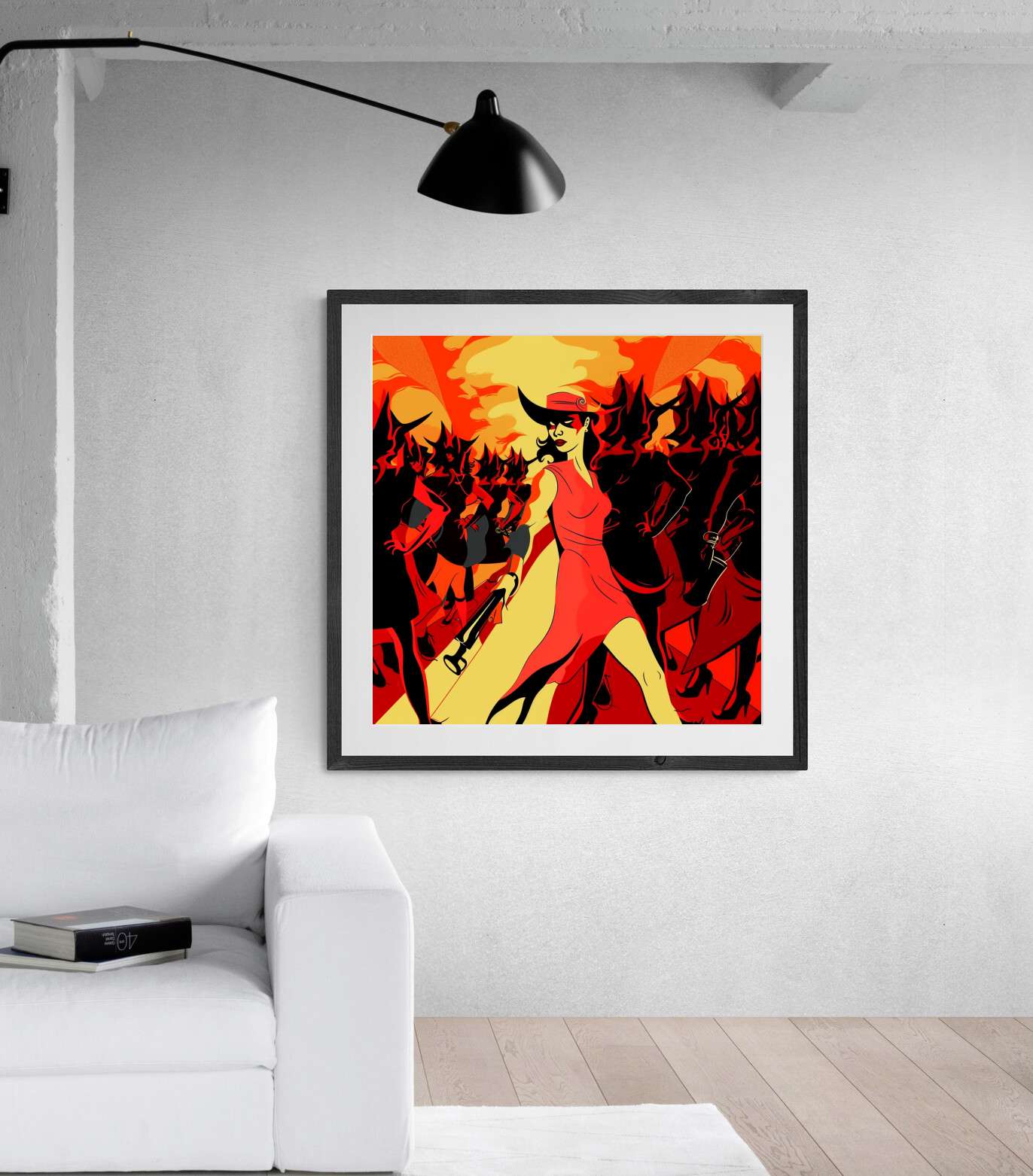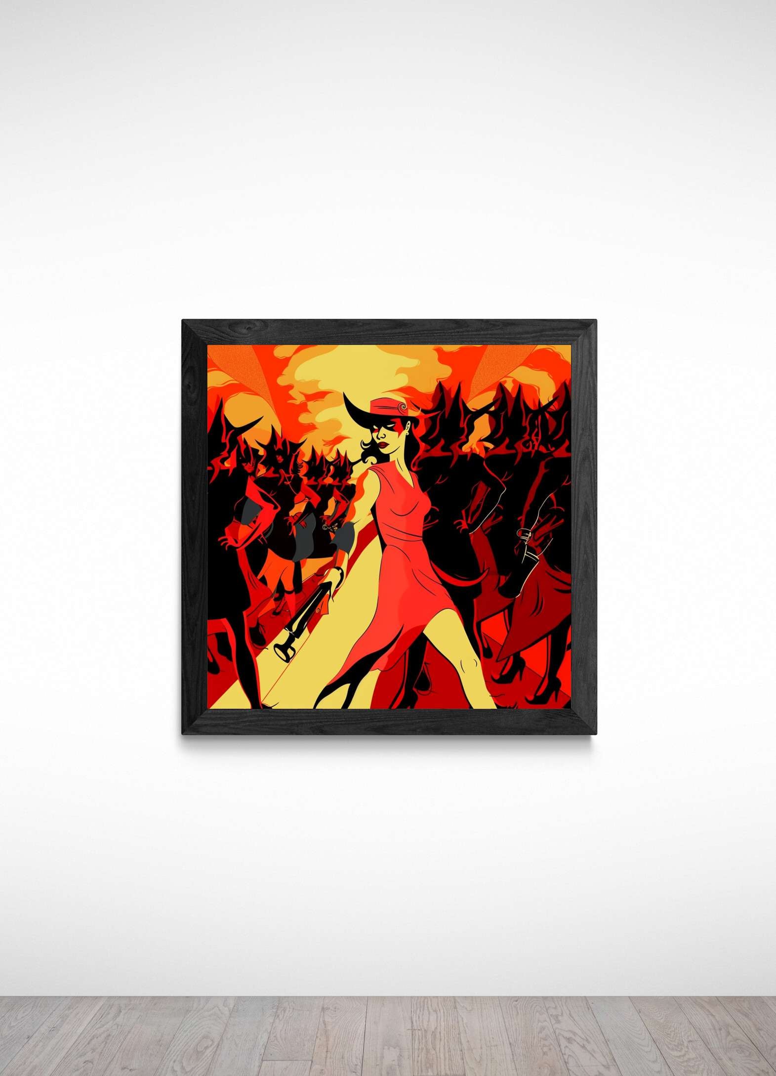 "March of the Dissidents" invites you into a surreal world where defiance takes center stage. A lone woman strides boldly through a sea of shadows, embodying strength and independence in a world dominated by conformity. The contrast of fiery reds and deep blacks evokes both tension and rebellion, while the woman’s confident walk symbolizes the courage to stand out amidst the noise and chaos of societal expectations.